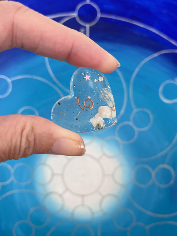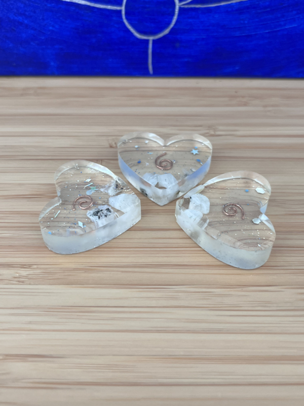 OverzichtMet dit Hartje onder de Riem heb je een bijzonder en liefdevol energetische tool in handen. In het hartje zitten steentjes van maansteen, een koper spiraal en glitter.