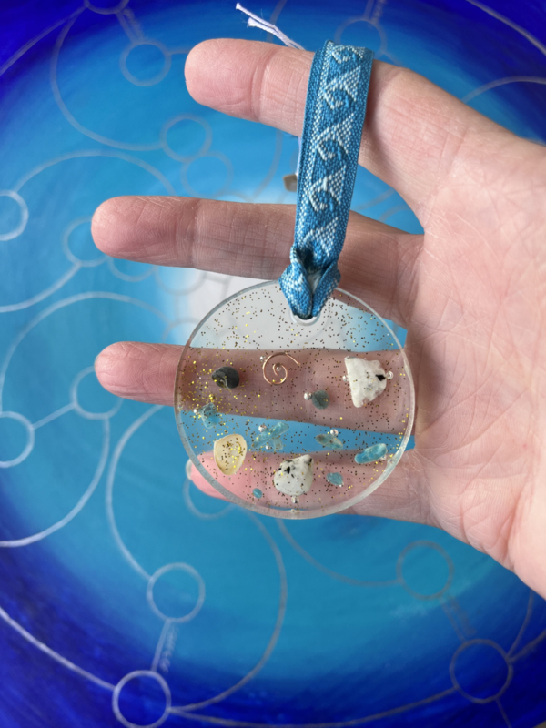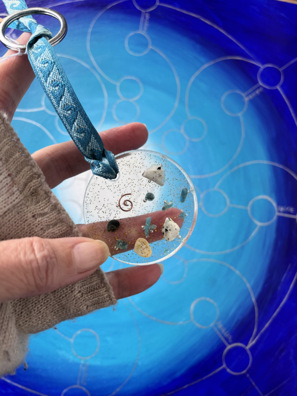 OverzichtDeze zomerse talisman zit boordevol strandgeluk. Gemaakt met zelfgevonden schelpjes, kleine steentjes van maansteen en chrysocolla, een vleugje glitter en een koper spiraaltje – allemaal gegoten in heldere giethars.