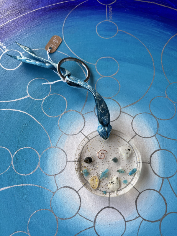 Zeemagie Chrysocolla & MaansteenDeze zomerse talisman zit boordevol strandgeluk. Gemaakt met zelfgevonden schelpjes, kleine steentjes van maansteen en chrysocolla, een vleugje glitter en een koper spiraaltje – allemaal gegoten in heldere giethars.